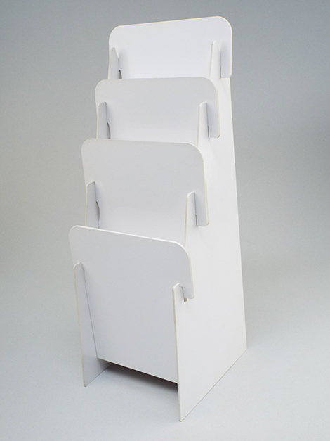 今回紹介するのは、3段パンフスタンドのVカット加工製品です。