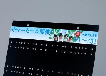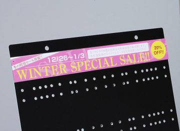 棚の横に掛けられるフックディスプレイは通年ではない短い期間の販促にぴったりですが、使い捨てになってしまうのは勿体無い。ということで広告スペースを際変えできるスペースを作りました。