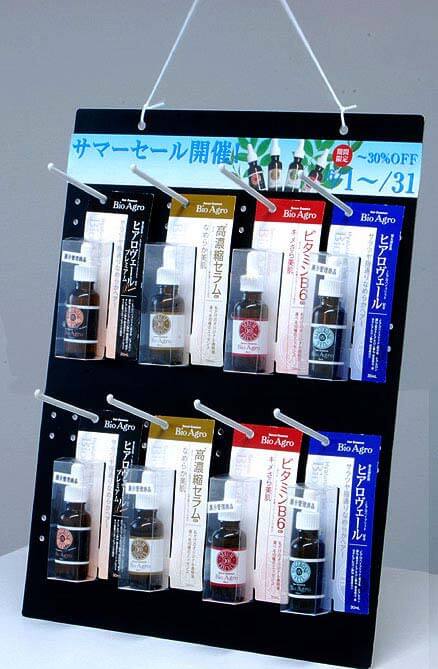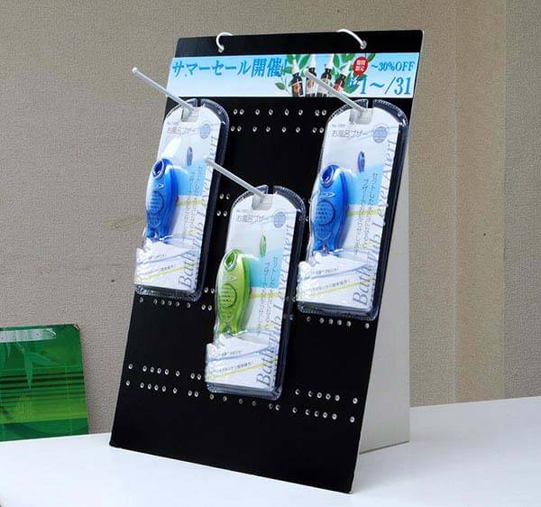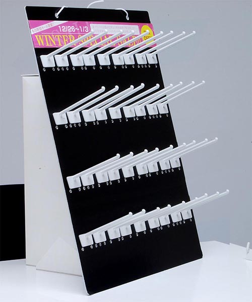 商品パッケージをフックにかけて、店舗の壁や棚の端に陳列する紙製の什器を汎用性を持たせ。既製品にしました。