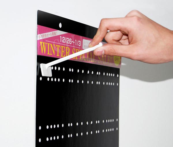 ボードにディスプレスフックを差す位置がたくさんある為、商品パッケージのサイズに合わせてフックの位置を決められるため、パッケージのサイズを気にせずどのような商品にでも調整が可能です。フックの取り付けも差すだけで簡単です。