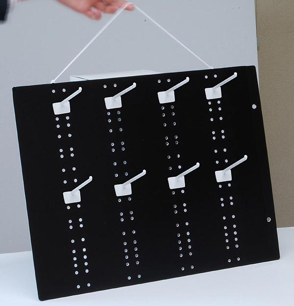 ディスプレスフックボードは通常、商品パッケージのサイズに合わせてフックの位置や、全体のサイズを決めて作るりますが、どこでもハンガーボードはフックを差す穴を複数あいています。