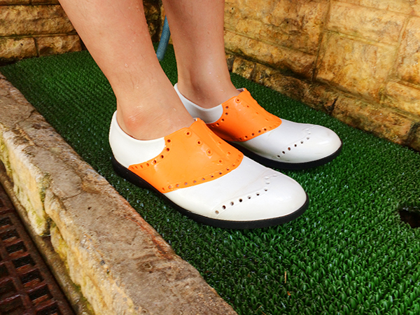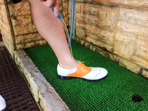 ゴム素材のラバーゴルフシューズだから、汗が靴に染み込むことなくラウンド上がりは靴ごと水で流れせます