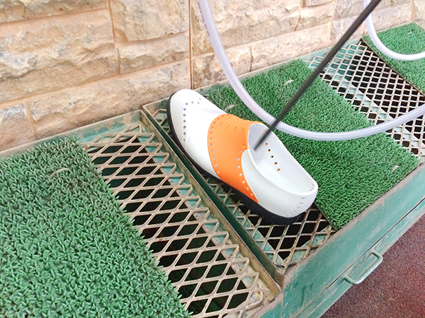 ゴルフでラウンドが終わりクラブハウスに戻る時にはエアースプレーでゴルフシューズについた