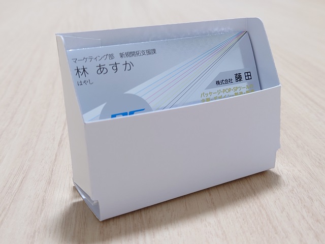 そんな際に役立つのが、ショップカードスタンドです。斜めに立てることができるので、遠目にもカードのデザインが目視しやすいです。スタンドの前面に「ご自由にお持ち帰りください」と印字すればお客様もためらわず手を伸ばすことができるでしょう。展示会の際など名刺を立てておくのにもおすすめのアイテムです♪