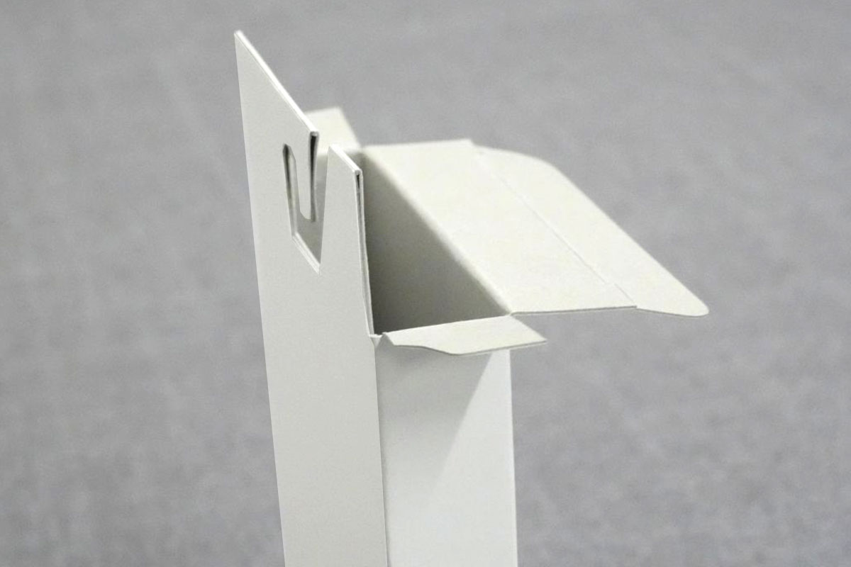 吊り下げヘッダー部分を貼っているため、すっきりとした見ためになります。また、組み立て時の作業時間が短縮できる化粧箱です。ヘッダー部分を変形穴にすることで、フック棚の後ろからも商品が取り出せるよう工夫しました。