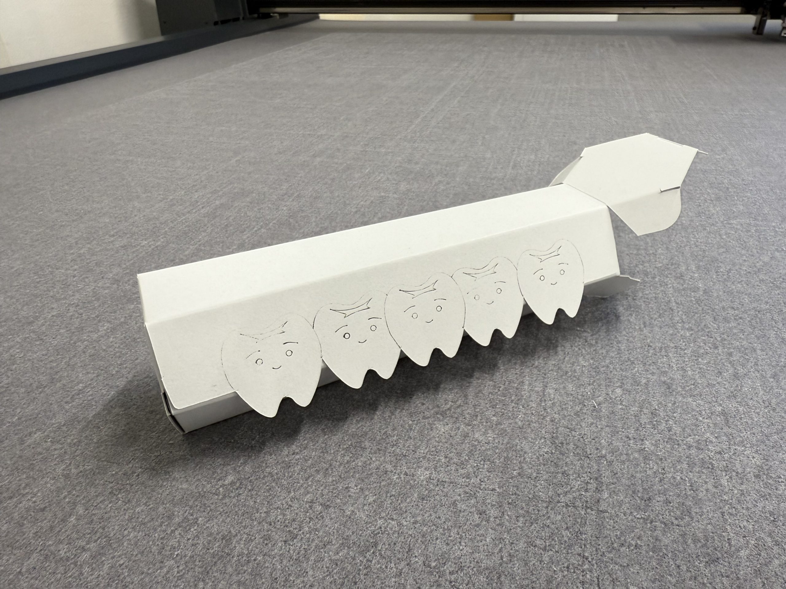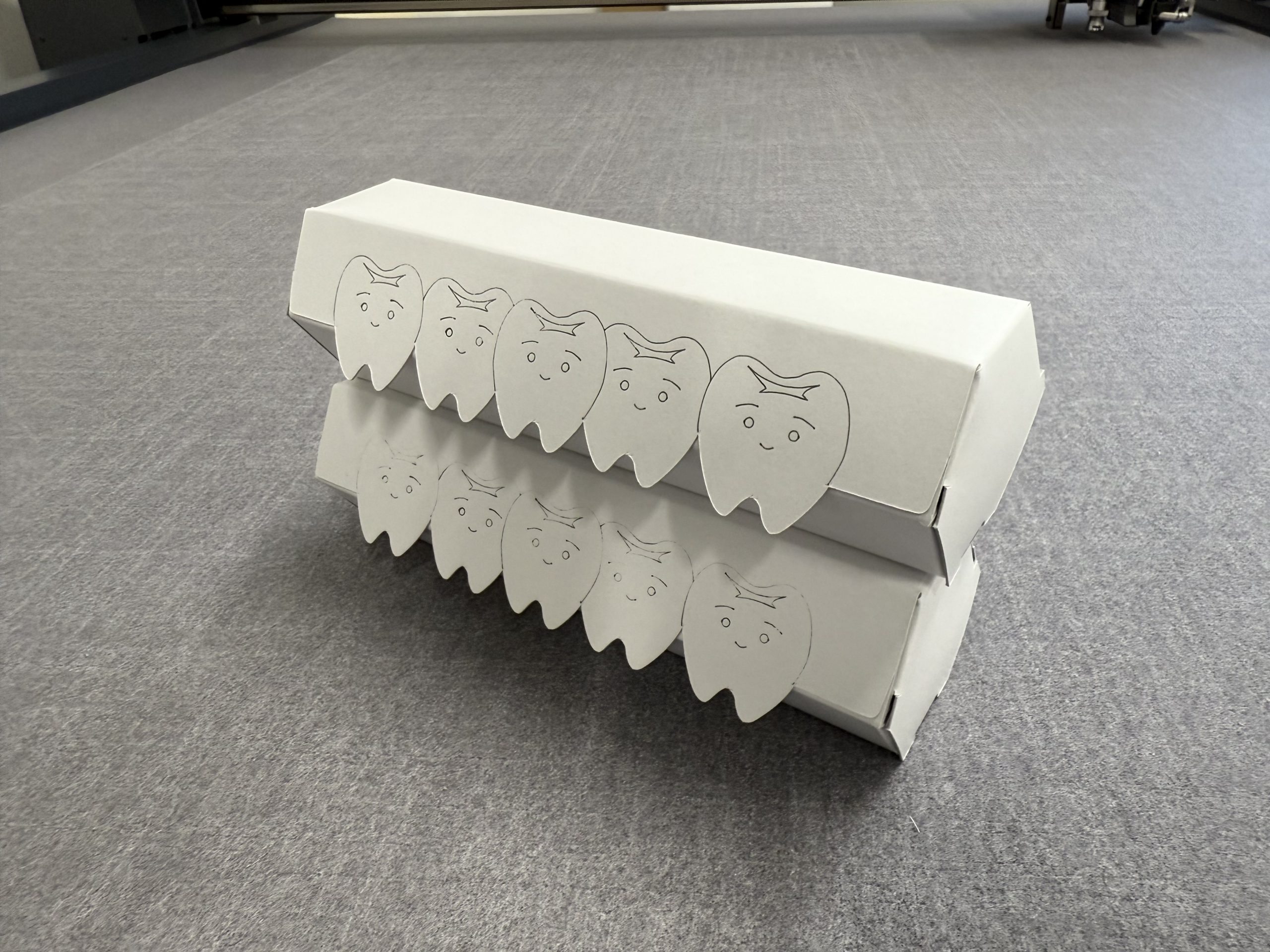 ①今回は六角形のカタチにし、正面に歯型のイラストポップをつけることによって
