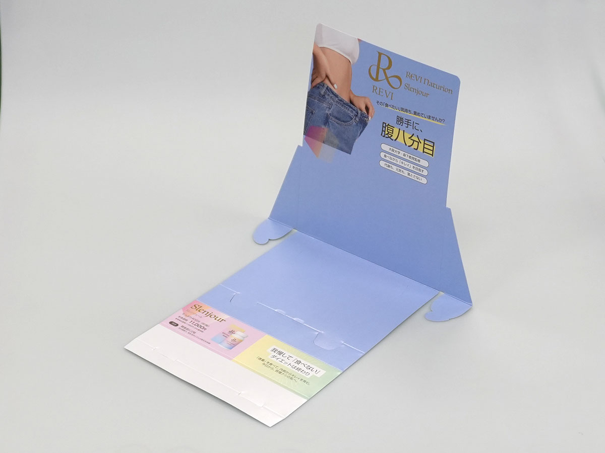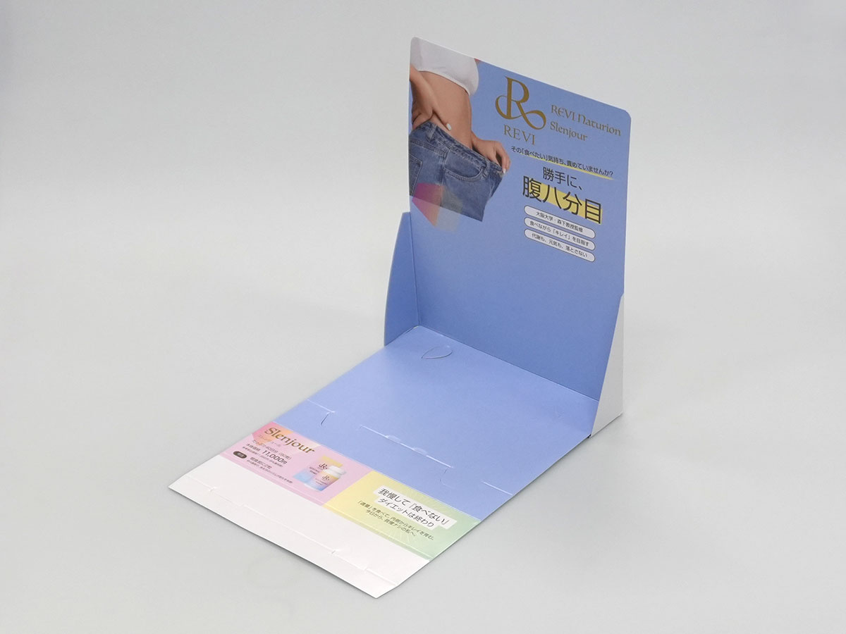 紙1枚で使用できるカウンター什器です。通常のカウンター什器だと、ダンボール製が多いのですが、形状を工夫して板紙のみで作成しております。
