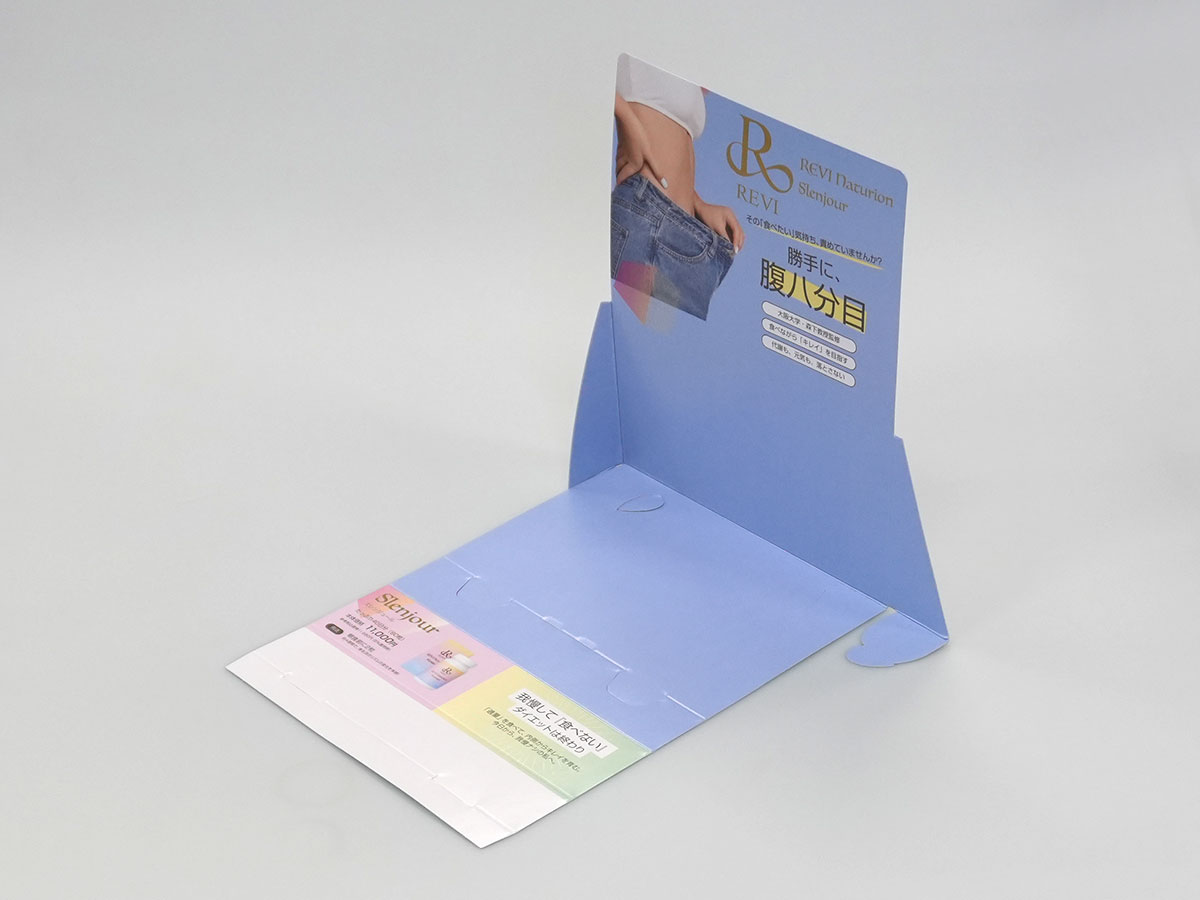 各店舗へも展示するサンプリメントのダンボールへ忍ばせるだけ(小スペース)で輸送可能です。いいこと尽くしの組み立て簡単展示台を商品のディスプレイとして活用してはいかがでしょうか。