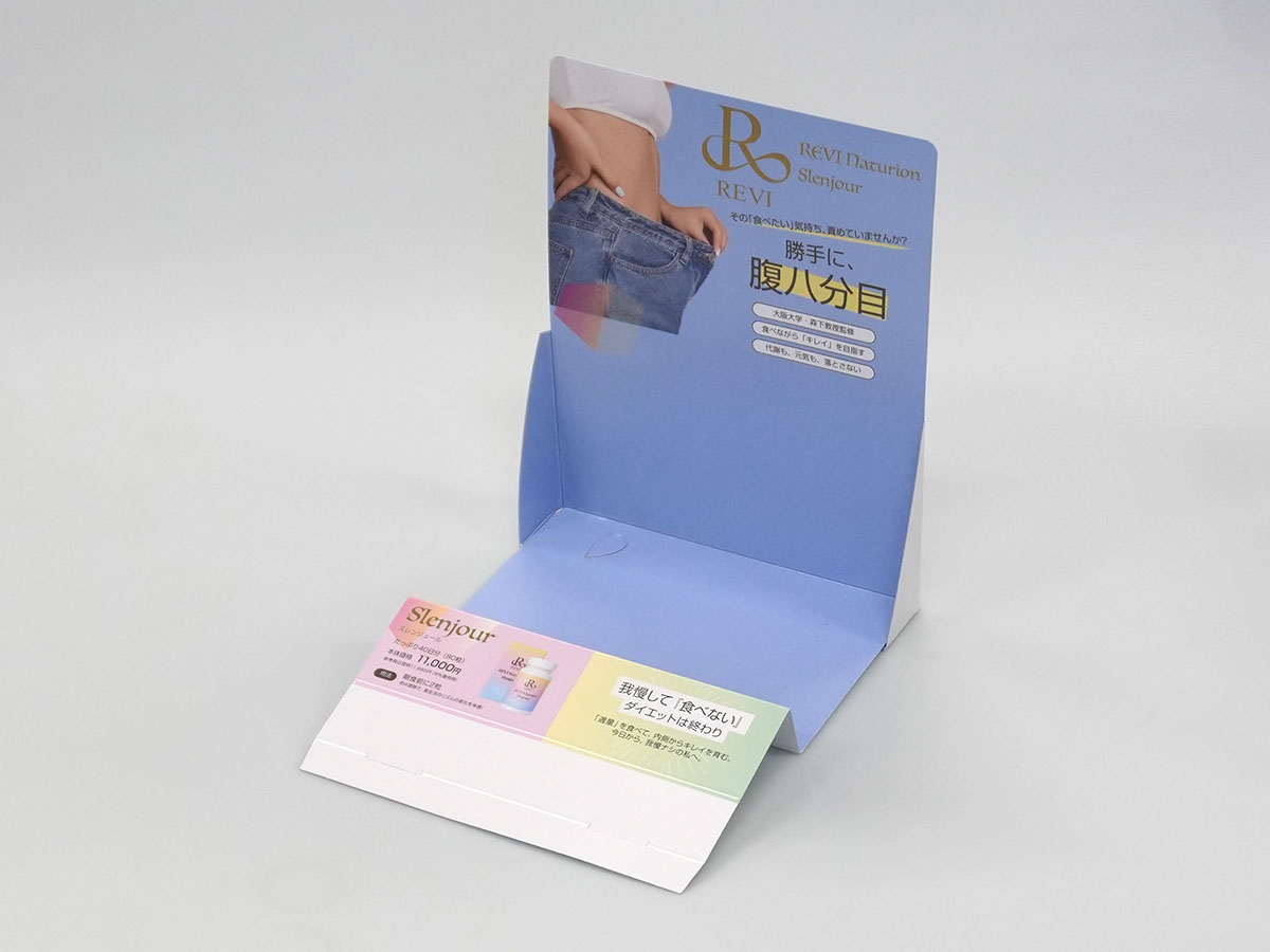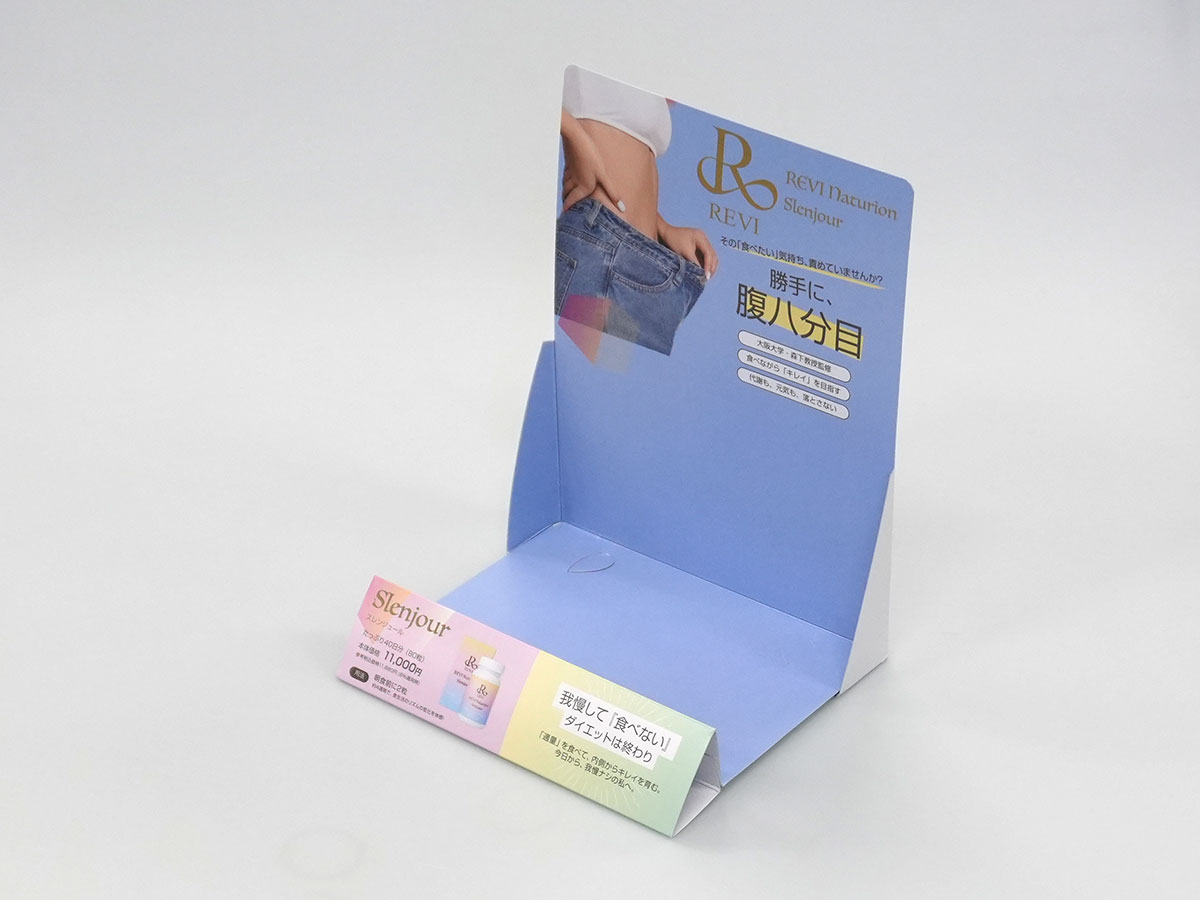 レジ横に設置するサプリメントの紙什器を作成したいが、初めての製作のため形状からご提案いただきたい。費用感もわからないためイチから教えていただきたい。急ぎで必要なため、提案から設計、製造までをスムーズに行ってほしい。