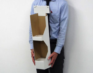 超大型ダンボール什器なのにコンパクトになって輸送費コストが1/4に削減