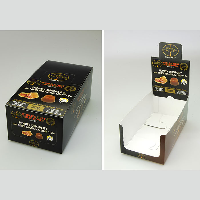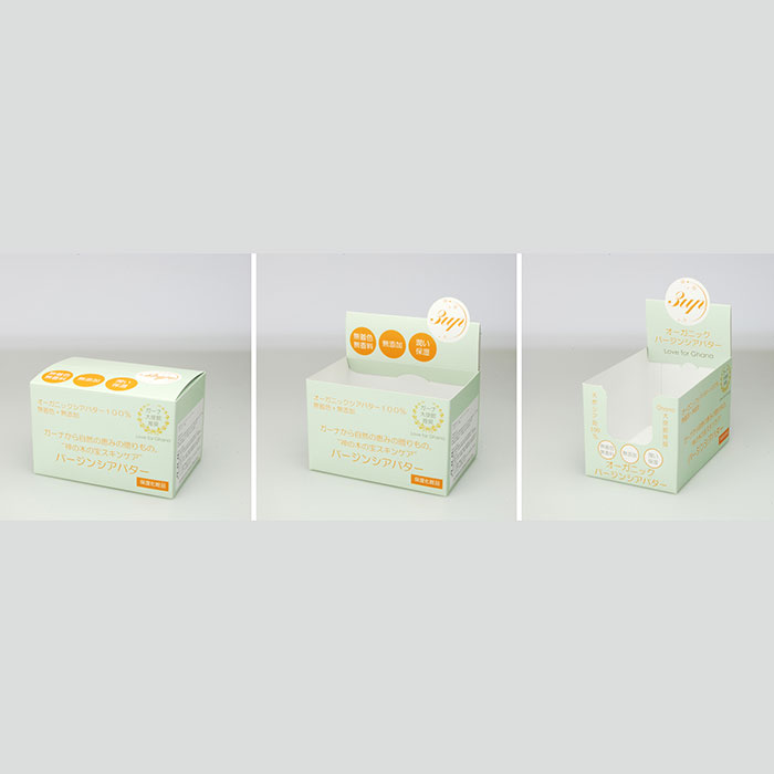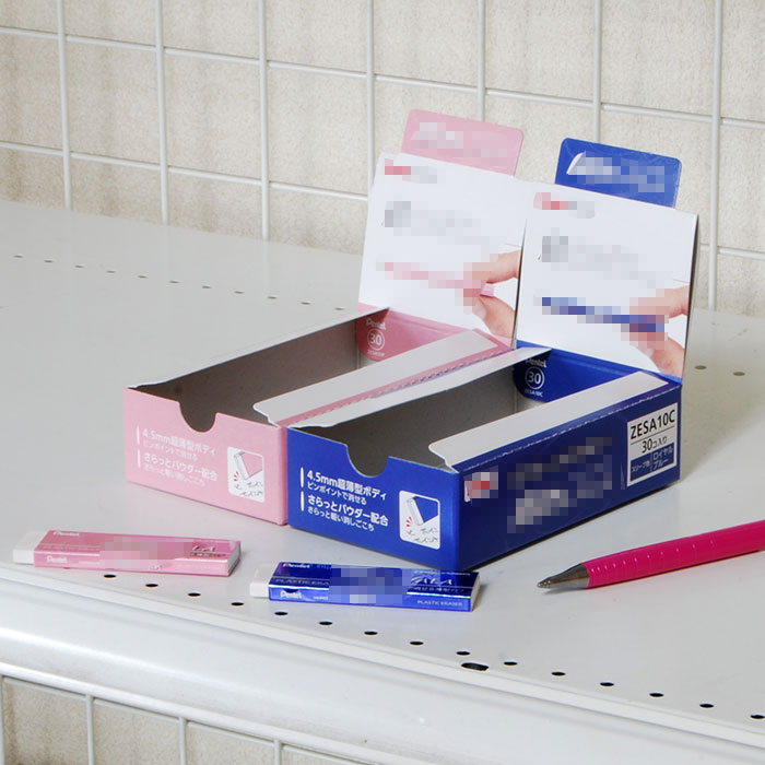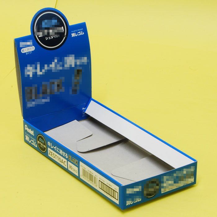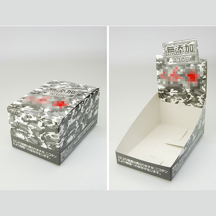 このディスプレイボックスなら、紙箱パッケージのミシン目に沿って紙をカットしてPOP部分を立ててれば、そのまま陳列できることが、時間の節約になるということで、店舗スタッフさんに喜ばれます。