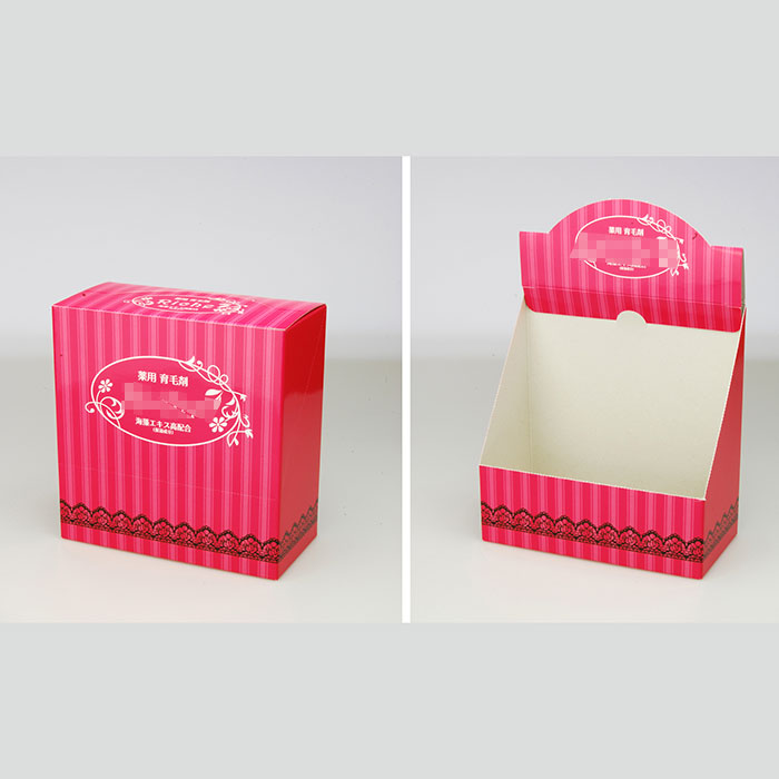 ディスプレイボックスは店頭の棚のスペース合わせ、縦か?横か?を設計します。ポップとなる部分を立てるため、縦横が棚のスヘースに合っていないと、せっかくのPOPが読めなくなってしまうからです。