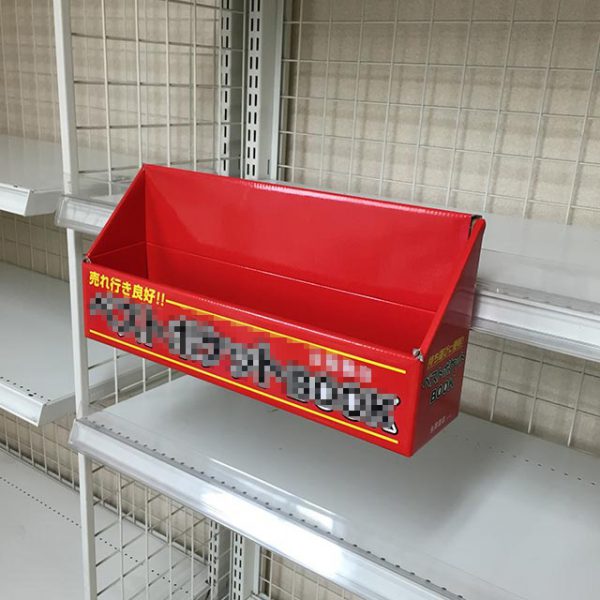 コンビニの書籍コーナーの棚にに掛けて、小型本やMOOK本などを入れて売上を伸ばす棚掛けディスプレイボックスです。