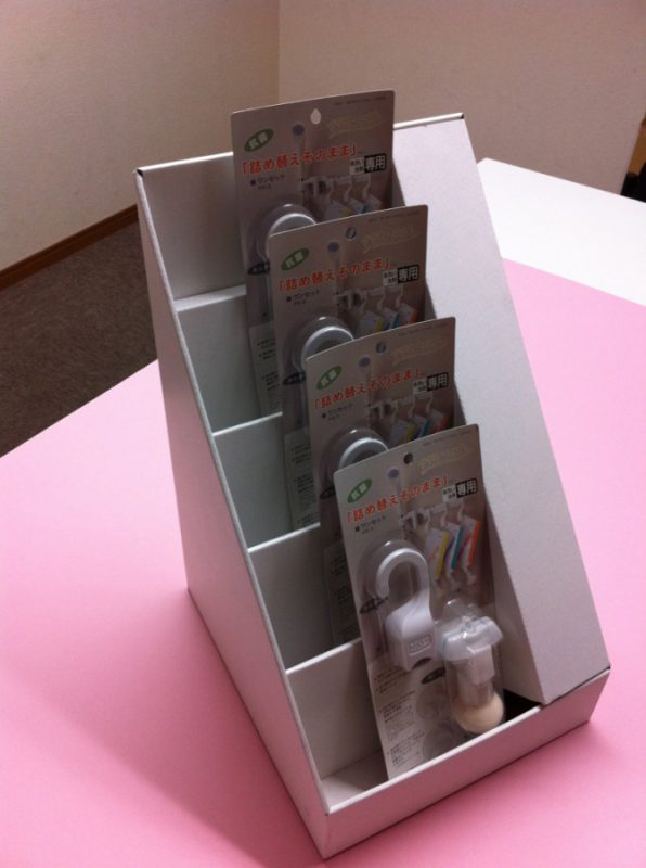 単純なひな壇では無く、ひな壇の手前に折り返しを付けて、商品を入れた時に手前に倒れないような機構を付けています。