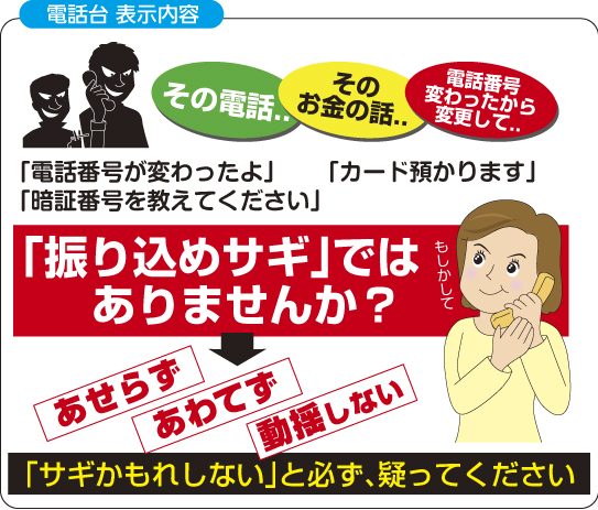 「振り込めサギ」の被害にあわないための防犯対策は、本人への確認、ご家族への相談です。