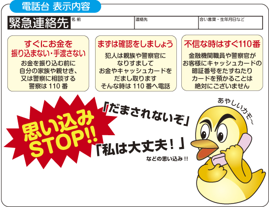 イザ、咄嗟の怪しい電話にも慌てること無く、冷静でいられるように、電話台の注意喚起文は、最新の「振り込めサギ」手口のキーワードを簡潔に、楽しいイラストキャラクターまとめました。