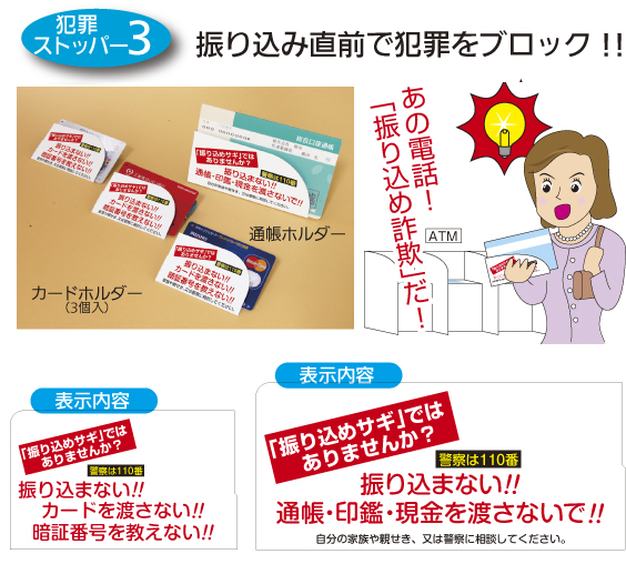 緊急時の連絡先を記入して、いつでも確実に連絡が取れるようにして「振り込めサギ」を撃退します。 「振り込めサギ」の防犯対策は、サギの内容を知ることです。