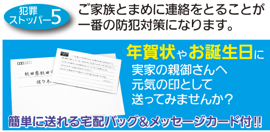 パッケージには警視庁がホームページで案内されている注意文を印刷してあります。また、パッケージを裏側にして一部カットするとお子様から実家に送れるように宅配&メッセージカードになっています。