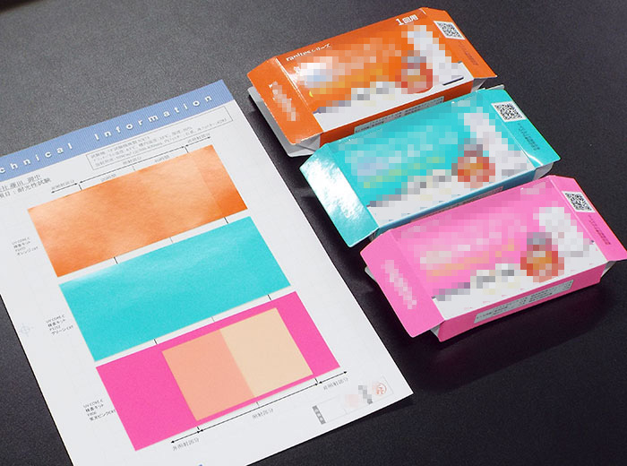商品パッケージの店頭での陳列の際、蛍光灯でどれだけ色が退色してしまうのか?を耐光性試験してみました。