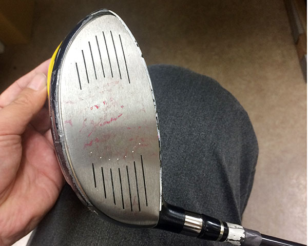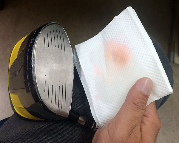 そして、この紅色のインク手で触っている程度ではもちろん色落ちしませんが、打った際には、衝撃が凄まじいためか、接触したクラブに写ってしまうんです。
