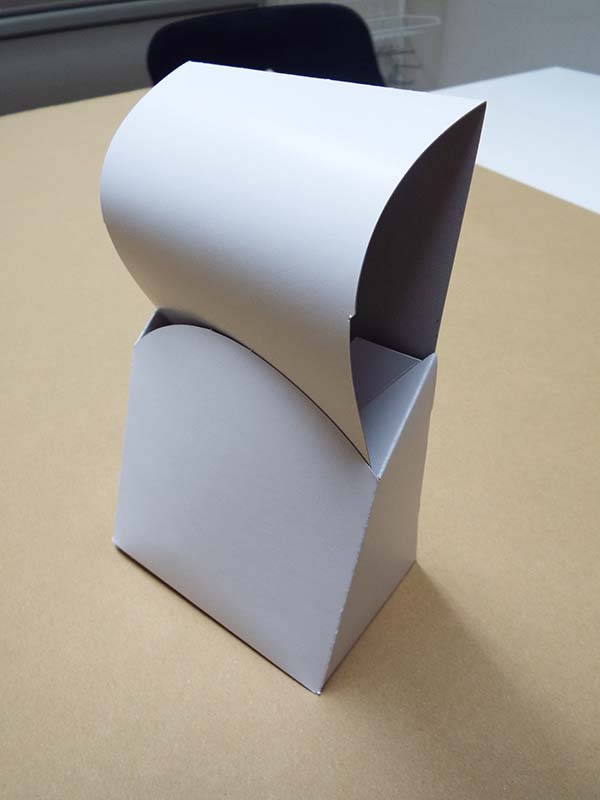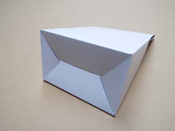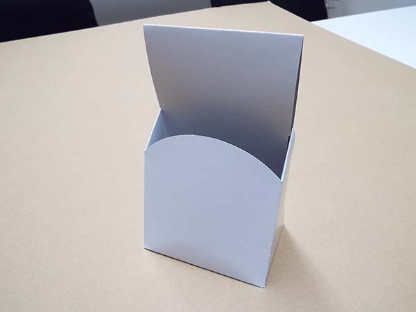 箱自体は、テーパーが掛かっていて、若干扇状になっています。糊しろ部分は差込み式なので貼り加工賃が削減されたパンフレットスタンドになります。