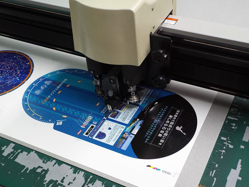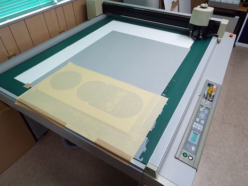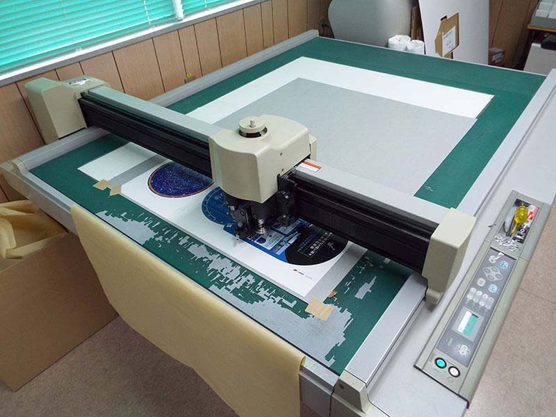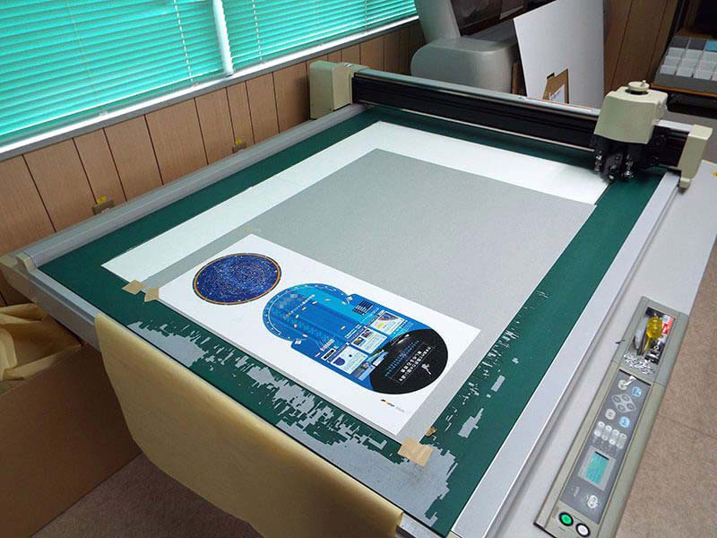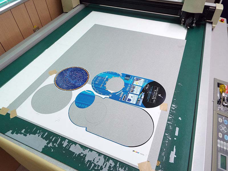 化粧箱、ダンボール什器の試作サンプルをカットしています。