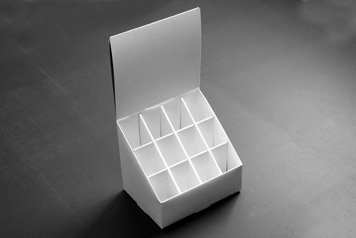 このタイプの販売台に設計した理由は、初回生製作時は化粧品のスプレー缶が全部同じ種類を陳列しましたが、後々のお客様の商品展開で、香りのバージョンを増やしていくということでしたので、違う種類のスプレー缶を入れても商品がわかるように設計しました。使用用途を限定させないための設計です。