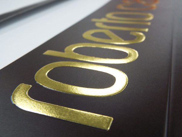 金箔・銀箔を使った箔押し加工の使い方としてブランドロゴ、商品名、社名などを目立たせることができます。写真の見本のように紙のバックを茶や黒にするとワンポイントでもボリューム感が増しさらに効果的に目立たせることが可能です。