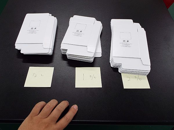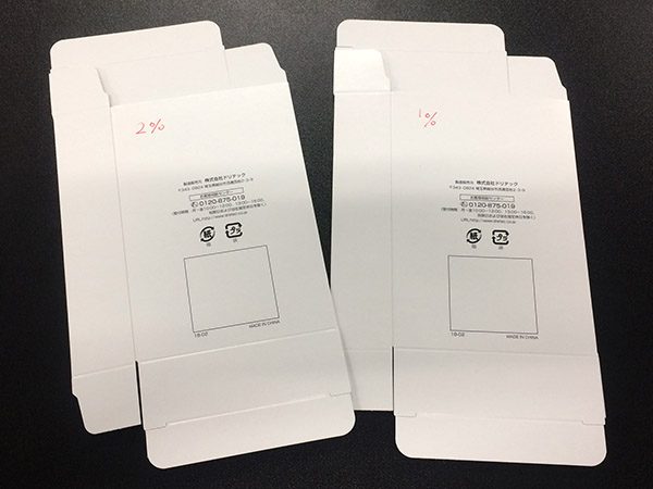 今回、試しに化粧箱に2%シリコンニスを加工してみましたが、2%はカードゲーム、トランプ用で滑りをより求める用です。2%はヌルヌルです。滑りすぎて化粧箱パッケージには向かなそうです。