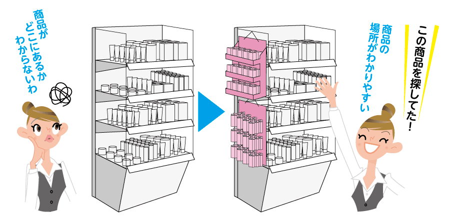 棚に陳列した場合、隣の商品と競合します。隣の商品とのカテゴリ分けも統一性がありません。棚の中から欲しい商品を探すということは労力になり、見逃されてしまうこともあります。