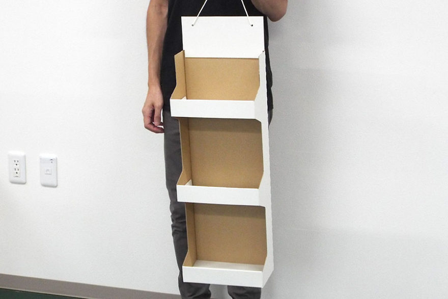1枚のみの紙で作ったローコスト什器。ポケットに商品を差し込みます。