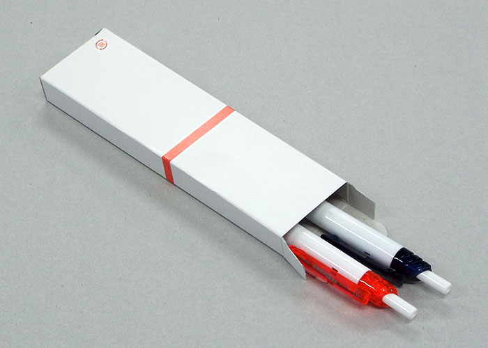 厚紙台紙にブリスターをスライドしてセットする、にスライドブリスターパックのペンパッケージです。