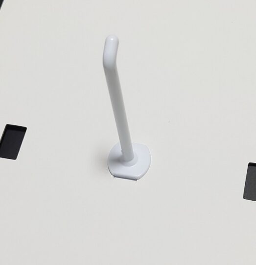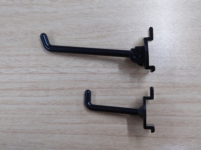 通常のハンガー台紙は、台紙にW12.5×H20mmの四角い穴をあけて上下に返しのあるフックを取り付けます。この返しがなかなかシッカリはまりますので、フックをつけ外しすると台紙が破れてしまうことも多いです。そもそもこのタイプは四角い穴を開けた位置にしかフックを取り付けできませんので汎用性を持たせようにも可動域に限度があるんですね~。(通常フック下記↓)