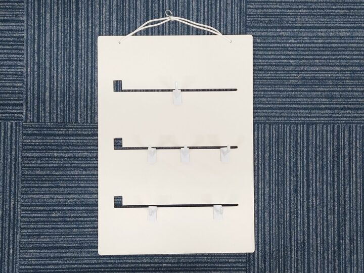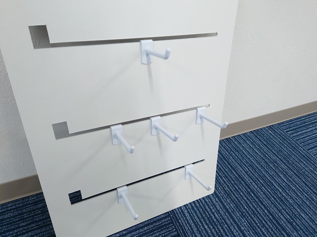 四角い穴を開けまくればよいのでは?とも思うかもしれませんが、先程ご紹介した通り、フックを着脱すると台紙が破れてしまいますし、穴と穴はある程度間隔を開けないと台紙がもろくなったり、そもそも技術的な面で抜型が作れなかったりします。