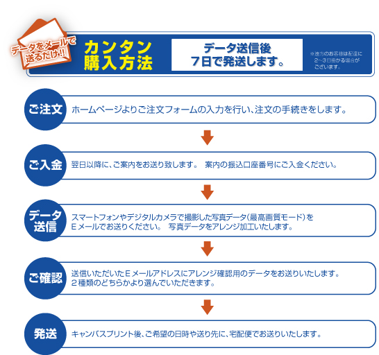・メールでのご確認はスマートフォン・液晶ディスプレイ・ブラウン管ディスプレイなどでご確認となり実際のプリントの色に比べ明るく見えたり、鮮やかに見えたりしてキャンバスプリントと見え方は異なります。