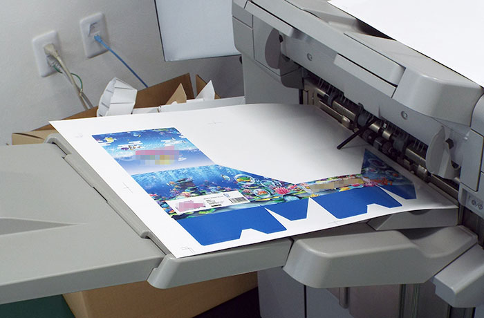 部数が多い場合は抜きの機械で、数が少なければサンプルカッターで箱の形状にカットします。