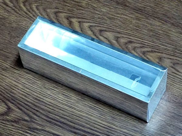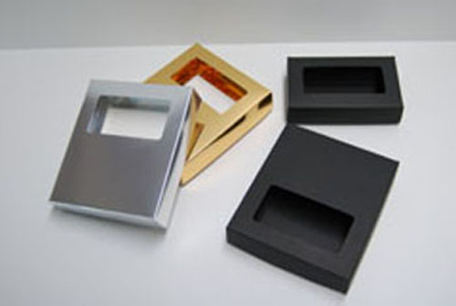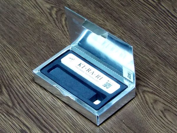 まずは一般的な名刺ケース。白紙で組立箱の身と蓋でできています。 蓋の方には、マド穴を開けて表面加工でPPマド貼りを施したものになっています。中に入っている名刺が誰のものであるか人目でわかる一般的な名刺ケースです。 それをゴールドやメタルの高級な紙で作成してみました。 今回はシルバーの紙、ゴールドの紙、マット調のブラック紙で作成してみました。紙を変えるだけでもイメージがガラッと変り、光り輝くゴールとメタルはセレブな高級感が出てます。 名刺を入れると、こんなゴージャスになりました。 仕様が高めの設定の商品、単価の高い商品には、ゴールドやシルバーのメタル紙で最高級の化粧箱パッケージに仕上げてみてはいかがですか?