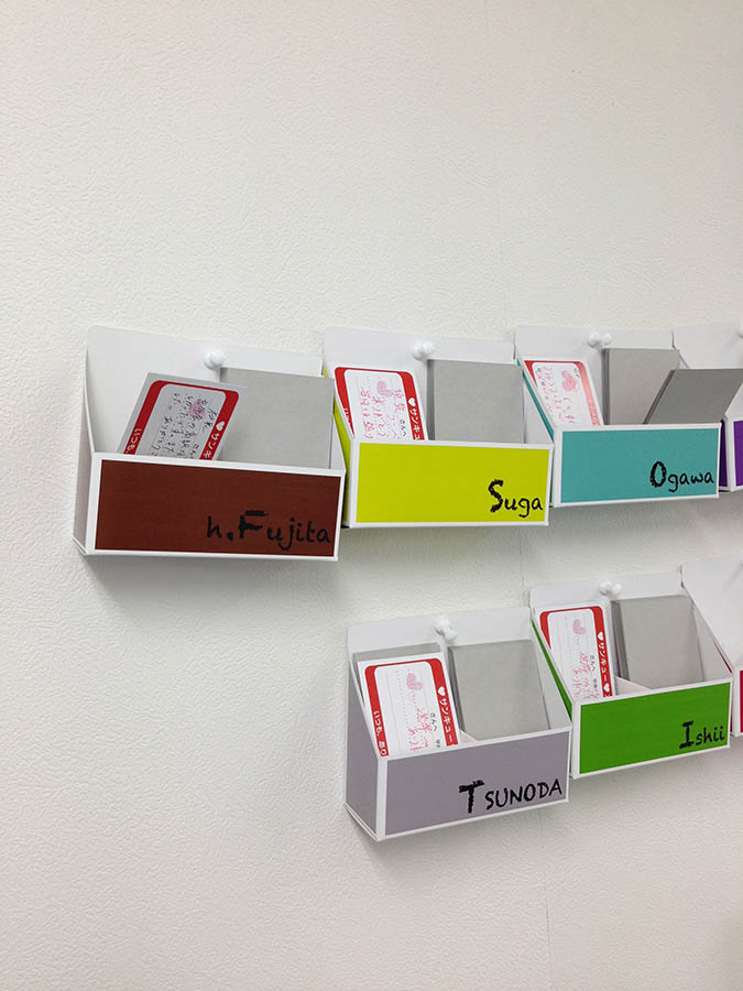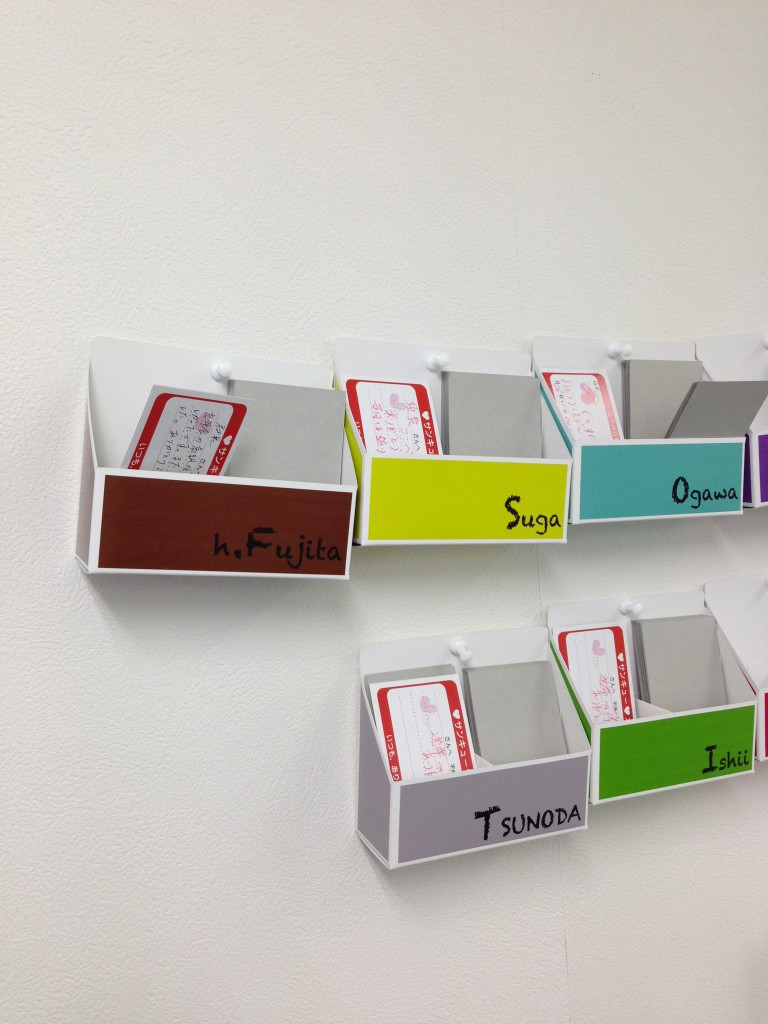 カードのケースを作り、壁掛けにしてみました。通路を通るついでにメッセージが遅れます。このような感じで、色々な社員の人とサンキューカードを通じてコミュニケーションが計れます。誰しも感謝されたり、褒められると嬉しいはずです。