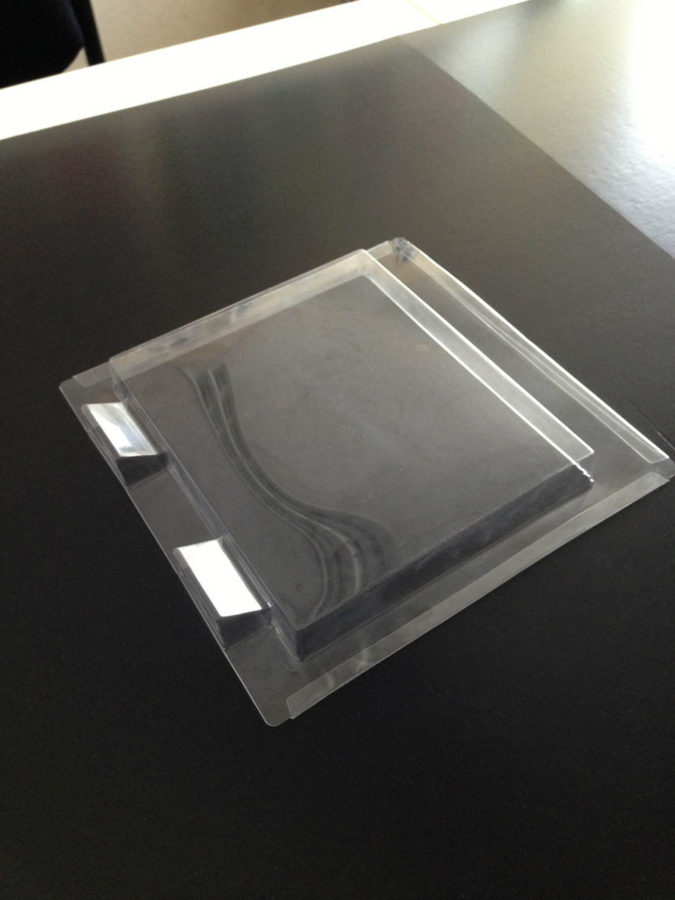ブリスタートレーのみの写真です。この様な凹型なので消しゴムが1個1個キレイに配列されます。このブリスタートレーを紙製のキャラメル箱に入れて販売させて頂いております!