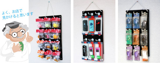 吊り下げタイプの商品と置くタイプの商品と2種類の商品を同時に陳列して販売したいとリクエストがございました!