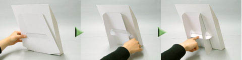 側面を立て、正面を折ると、切れ込みが」あり自動的にロックされます