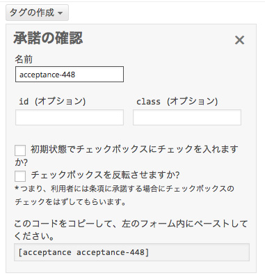 2.フォームメニュー右側の「タグの作成」をクリック、