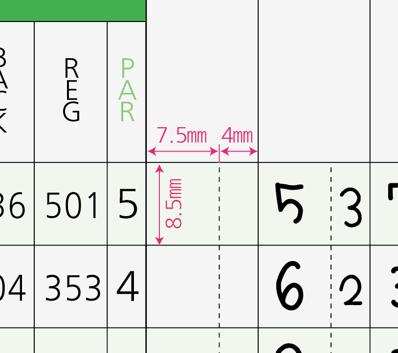 枠の中に書く文字に対して天地左右に1.5ミリ以上ずつスペースがないと、文字は書きにくくなります。