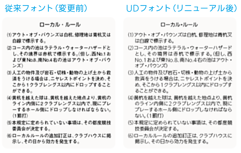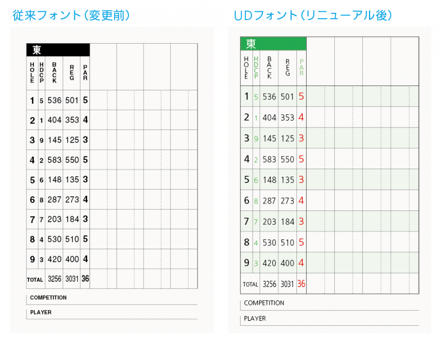 UDフォントでデザインしたゴルフスコアカードは小さい文字でもまったく読めない箇所が少なくなります。