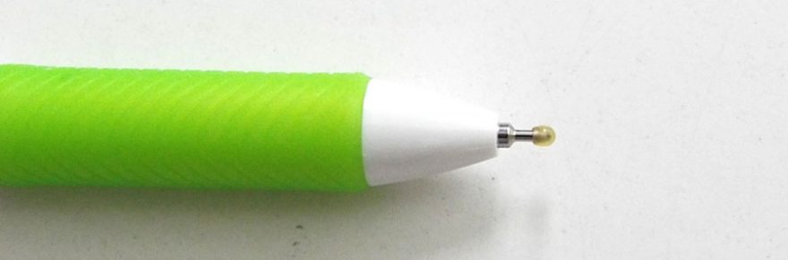 今回は、ぺんてる製品エナージェルXの白軸ライムグリーンに名入れをします。