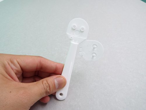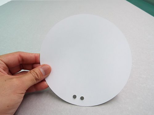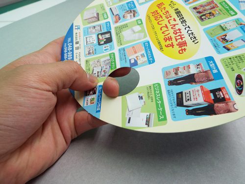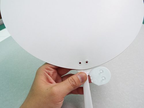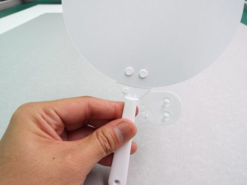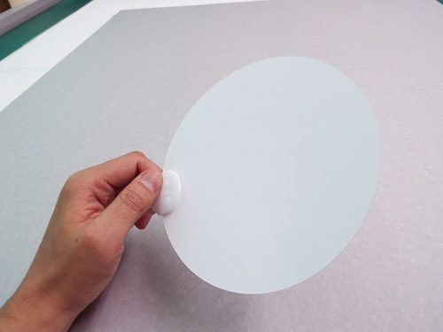 下記の写真は、150φの小さな台紙に穴が開いています。そこに団扇用取手をはめて、挟み込んで完成です。こちらは、円が小さい為折り返し無しの単紙になっています。