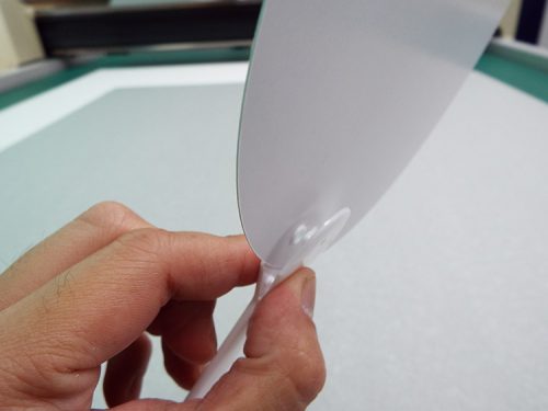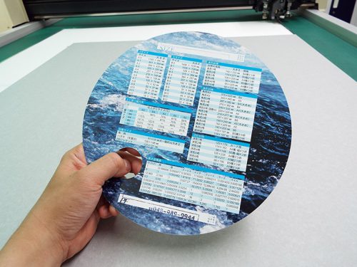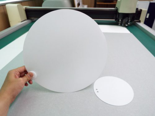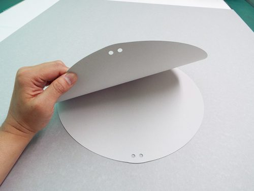 また、下記の写真は、300φの大きな円の2ツ折り台紙に穴が開いています。300φの方はサイズが大きい為、シナリが大きくなってしまう為、2ツ折りにして強度をつけました。