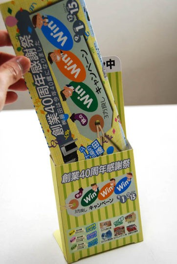 紙脚を別に作りつけない紙脚一体タイプで、紙脚を一体にすることで1枚の紙からできるのでローコストでいけます。デメリットももちろんあり、強度を保持できないため厚みを多くできないので、収納できるチラシの枚数が少なくなります。