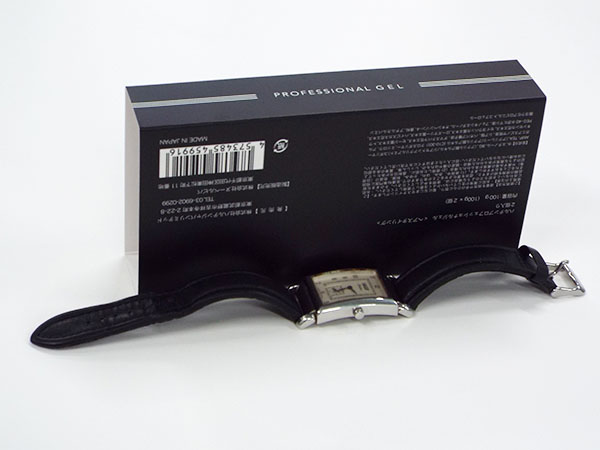 黒1色のパッケージです。形状はスリーブといって帯状の外側を身側になる箱形状にスライドして使用する化粧箱パッケージです。