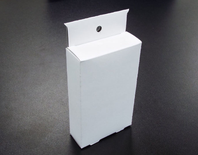 フックのある什器にかける場合には、ヘッダーをつけてフック穴がある化粧箱にしなければいけません。